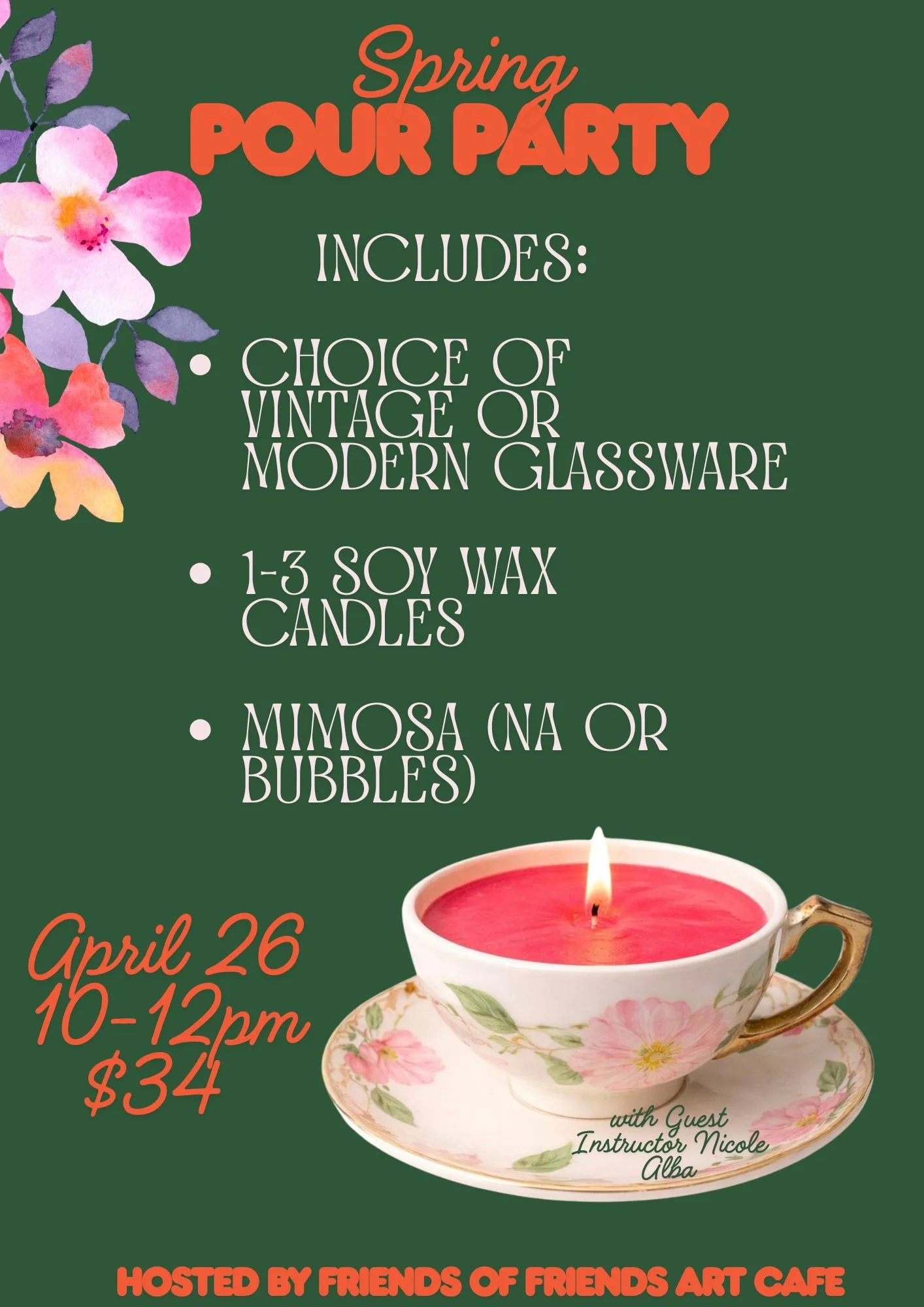 Meet your pals, grab a mimosa or NA beverage (complimentary), and choose from a huge selection of gorgeous vintage and modern glassware for your candle. Expert candle pourer, Nicole will then guide you through selecting custom scents made with essential oils and demonstrate how to mix and pour into your vessel.